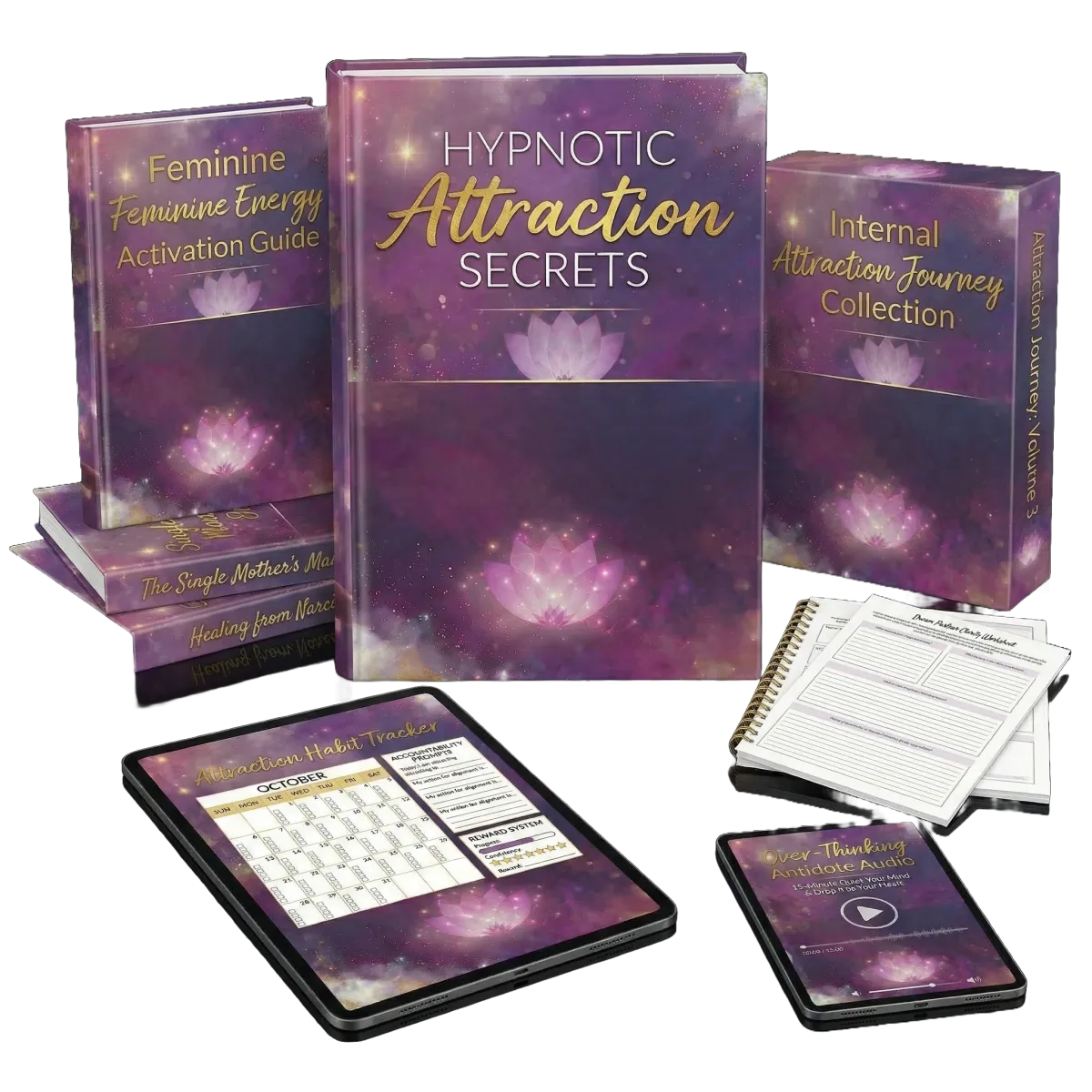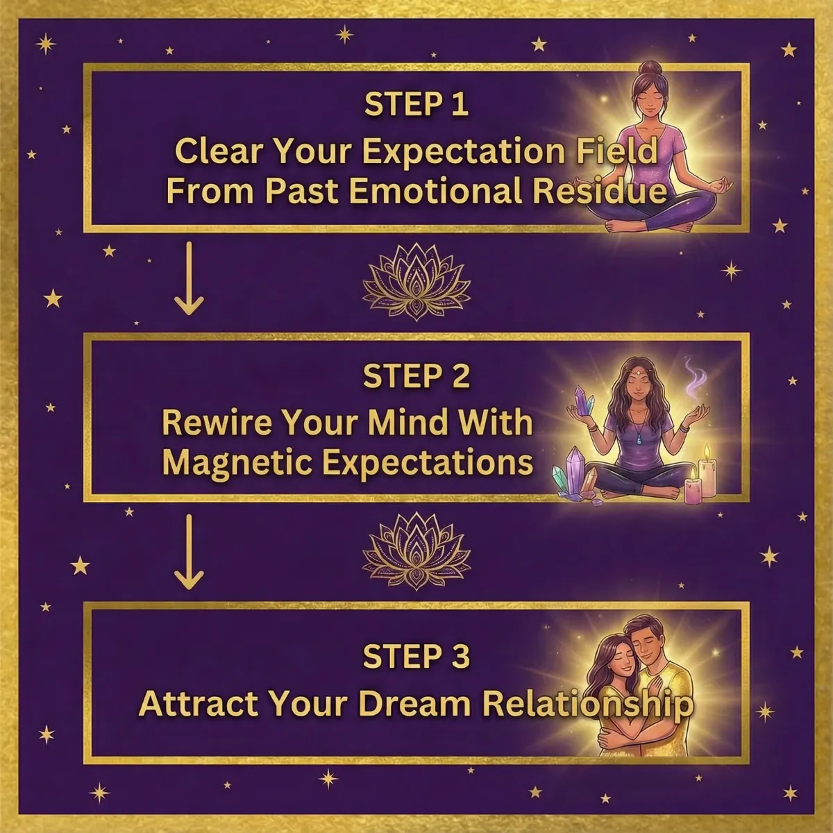You'll master the three sacred harmonies of attraction, the 2-Step Universal Alignment Method, and step-by-step rituals including the Sacred Mirror Ritual, the Resonance Bowl, the Cord-Cutting Ceremony, and the Great Love Invitation Spell.